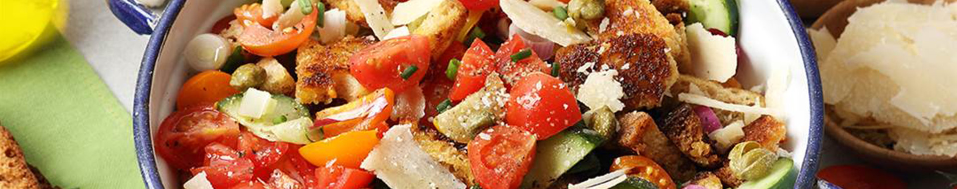 Ensalada de pan crujiente con tomates, pepinos, cebolla roja, capers y Grana Padano