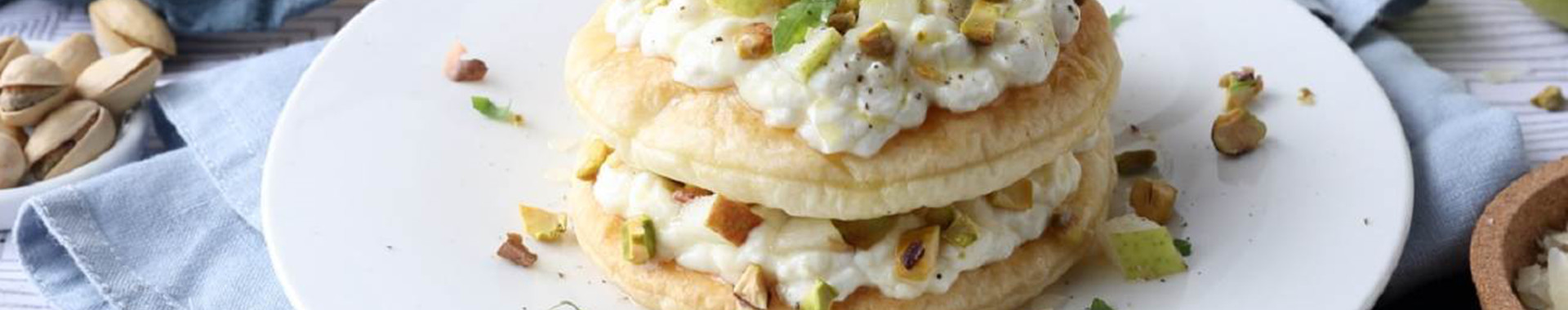 Tartiner les disques feuilletés avec la mousse obtenue, garnir de feuilles de roquette, de cubes de poire et de pistaches concassées. Assemblez le millefeuille en superposant deux disques fourrés, servez aussitôt avec un filet d’huile d’olive extra vierge et du poivre fraîchement moulu.
