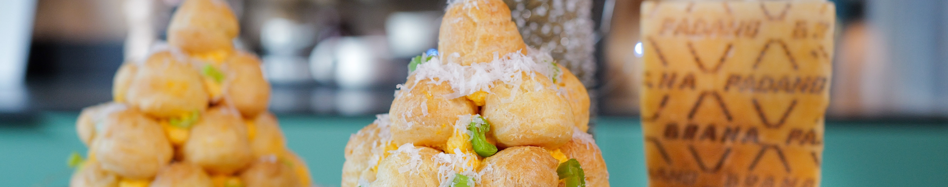 Pocher les petits choux (diamètre 1.5 cm) sur une plaque allant au four, recouverte de papier cuisson, râpez du Grana Padano dessus, et enfourner pour 30 minutes à 180°C.