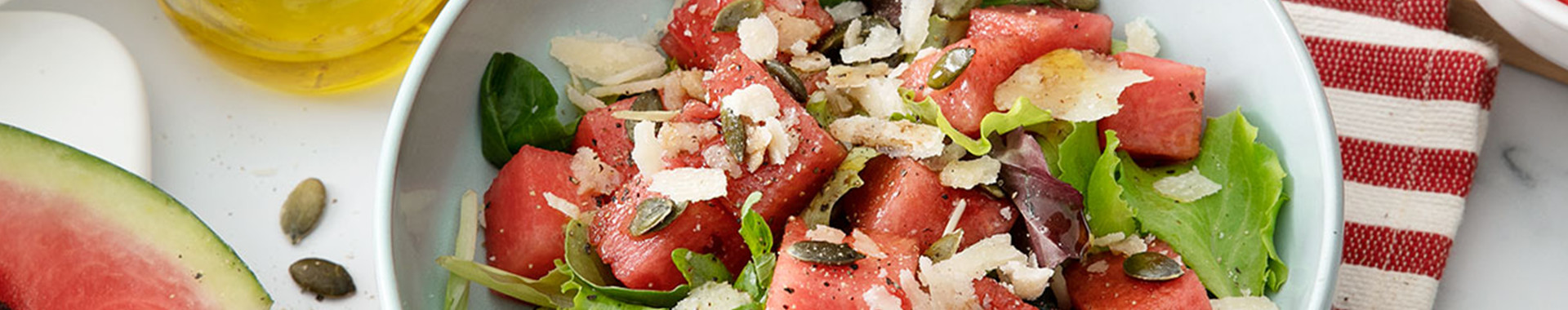 Salade de pastèque, misticanza, graines de courge et flocons de Grana Padano