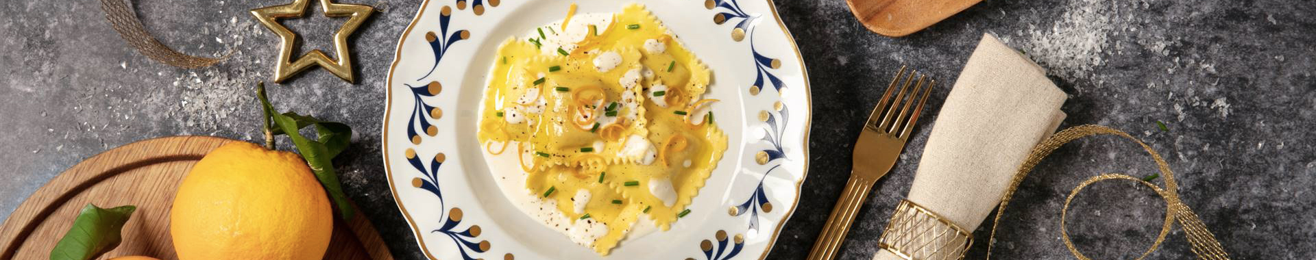 Servir les raviolis avec la fondue de Grana Padano et les garnir d’un zeste d’orange et de ciboulette hachée.