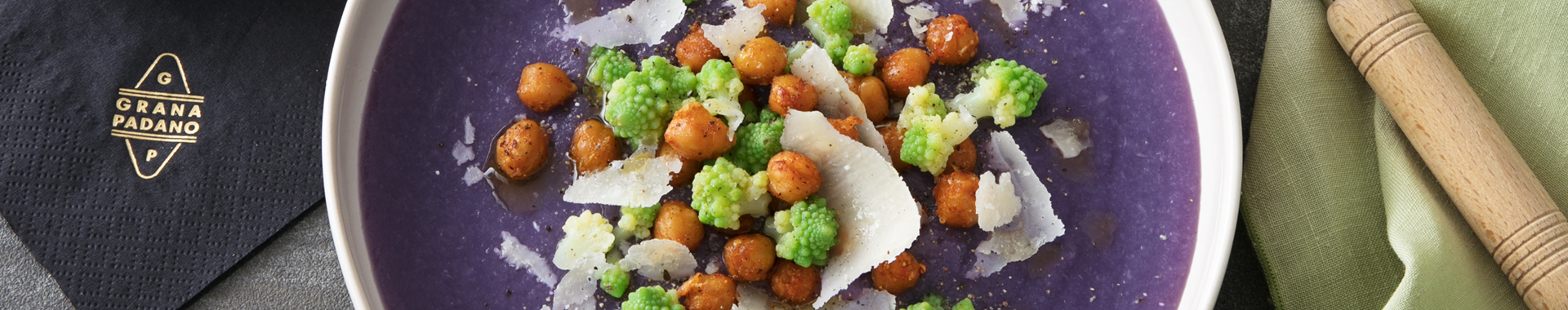 Servir la crème veloutée bien chaude et garnie de pois chiches croustillants au paprika, de fleurettes de chou romanesco, d’un filet d’huile d’olive vierge extra et de pétales de Grana Padano.