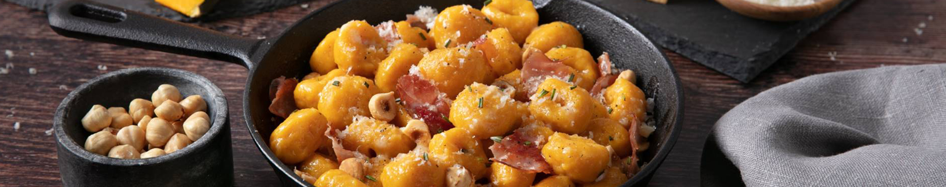 Faire cuire les gnocchi de courge dans une grande quantité d’eau salée. Une fois cuits, les transférer dans une poêle avec un filet d’olive vierge extra et un brin de romarin. Les faire revenir en ajoutant le speck haché et le Grana Padano râpé.