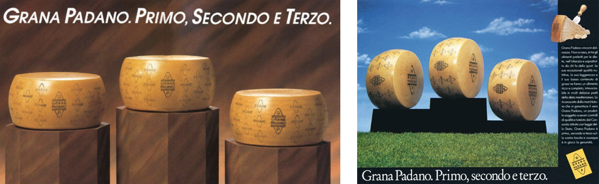 La campagna degli anni 1987, 1988 e inizio 1989 è caratterizzata dal claim “Primo, secondo e terzo”, Il tema ha dato lo spunto per orientare l’attenzione sulle tre fasce di consumo di Grana Padano, primo, secondo e terzo piatto, focalizzando l’attenzione sui secondi.