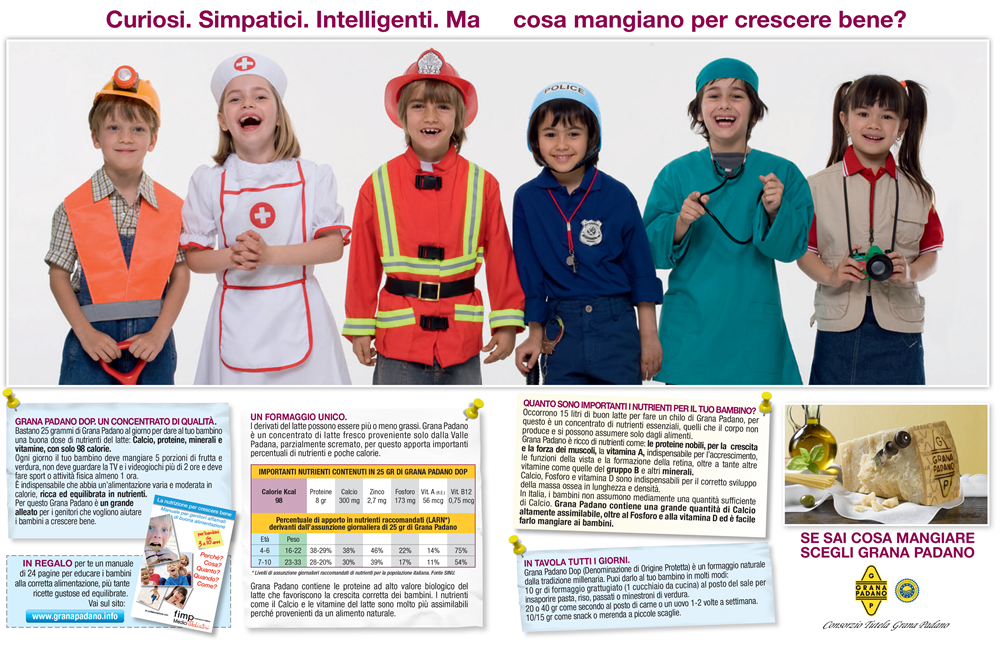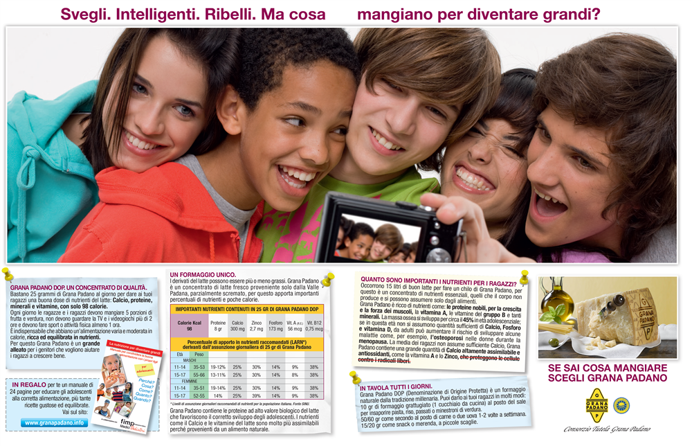 La campagna declina il concetto delle caratteristiche nutrizionali presenti in Grana Padano e si rivolge a bambini, adolescenti, adulti e over cinquanta, presentandosi come un alimento ricco e completo, adatto a tutta la famiglia e rafforzando le sue credenziali di autorevolezza, trasparenza e genuinità, elementi essenziali nelle scelte dei consumatori.
