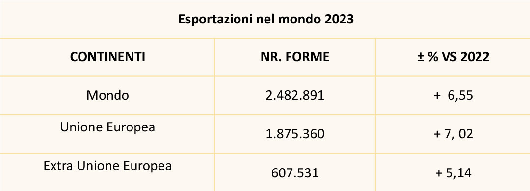 Elaborando i dati pubblicati da ISTAT sull’export dei formaggi, emerge che nel 2023 le esportazioni di Grana Padano DOP raggiungono complessivamente 2.482.891 forme, in crescita del 6,55%. “Ciò significa che nel 2023 il 48,4% della produzione marchiata è stata destinata ai mercati esteri – commenta il Direttore Generale del Consorzio di Tutela, Stefano Berni – Considerando, inoltre, un incremento dei prezzi al dettaglio di Grana Padano superiore al trend dell’inflazione, l’incremento della spesa mondiale di Grana Padano sfiora il 15%”.