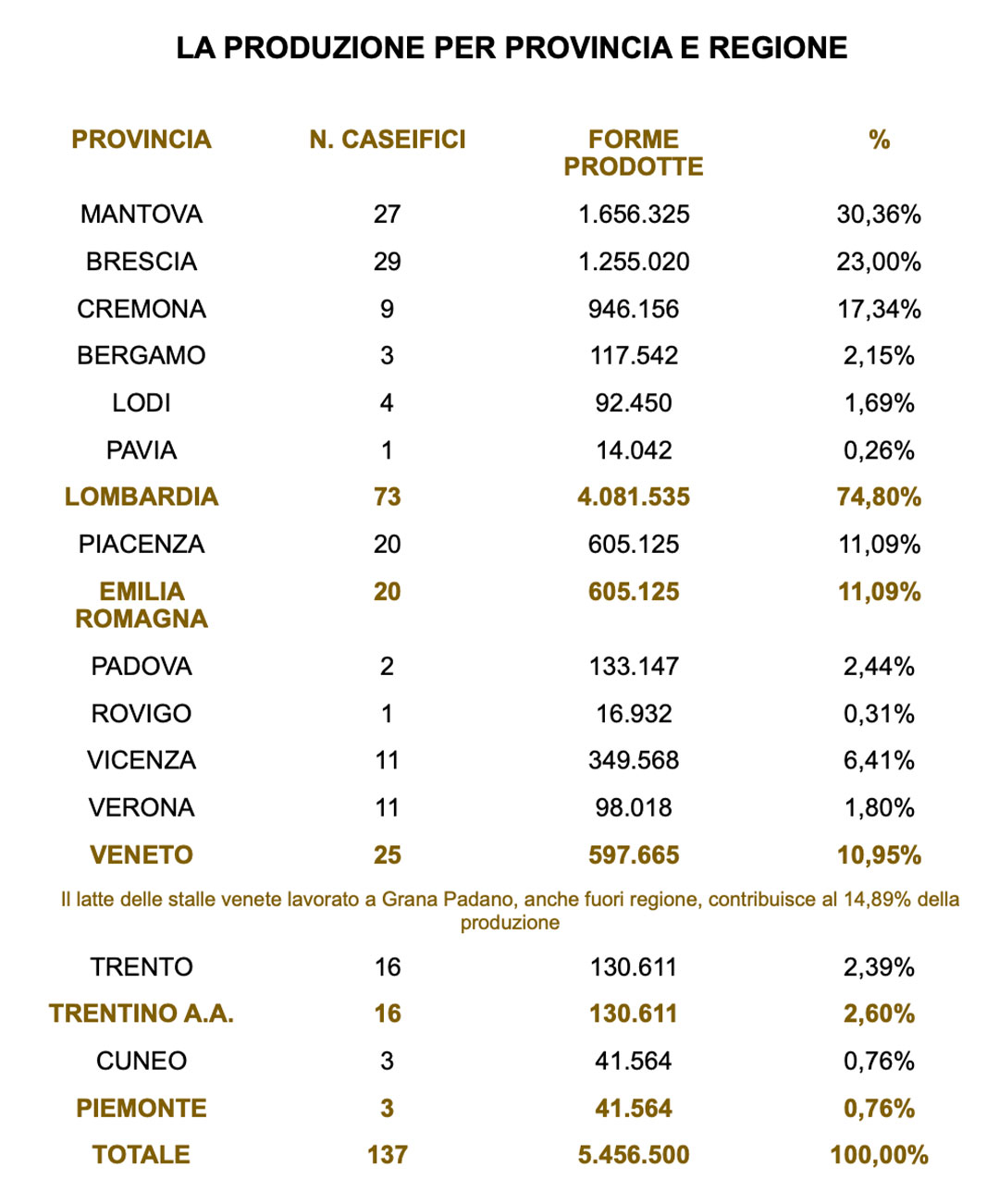 Ripartita su base territoriale e comprendendo tutte le strutture produttive, la provincia di Mantova con 27 caseifici risulta il territorio più produttivo con 1.656.325 forme pari al 30,36% della produzione (29,8% nel 2022). Seguita da Brescia, con 1.255.020 forme lavorate in 29 aziende, e Cremona, con 946.156 forme uscite dai suoi 9 caseifici, che hanno quindi la media produttiva più alta nel consorzio con più di 105mila forme lavorate.