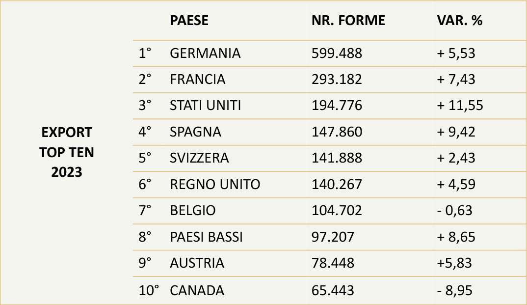 L’Europa, con 2.060.484 forme, assorbe l’83% delle esportazioni di Grana Padano DOP, con un incremento del 6,9% rispetto al 2022. E la Germania, con una crescita del 5,53%, consolida sempre di più il primato di principale destinatario per le esportazioni di Grana Padano DOP, per un totale di 599.448 forme.