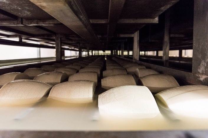 Uno spettacolo che si trasforma in una danza quando è tempo di girarle prima di riposare nelle fascere di acciaio e 2 giorni dopo andare in salina che qui si presenta con un suggestivo sistema di vasche, pendoli e pesi che, a intervalli regolari, spingono le forme sotto l’acqua salata.
