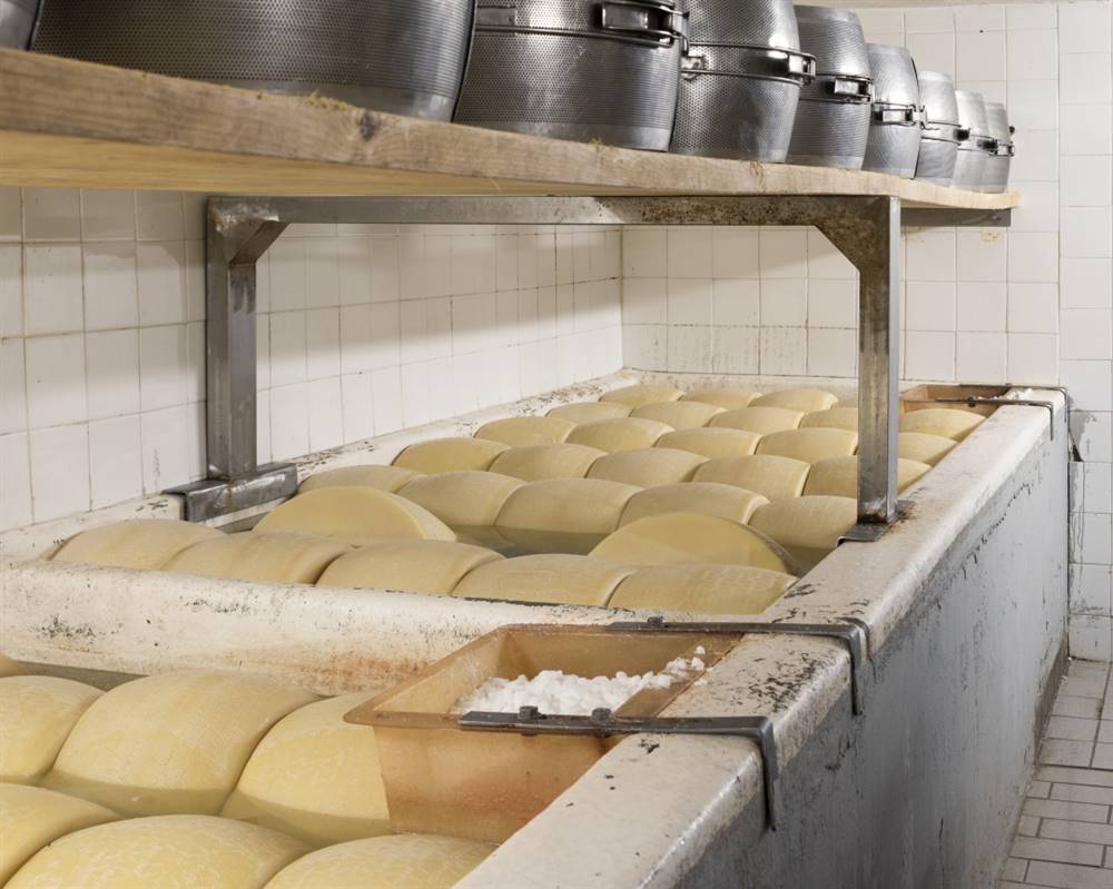 La lavorazione inizia con la coagulazione e la rottura della cagliata, prosegue con la cottura a vapore nelle otto caldaie di rame presenti nel caseificio fino ad arrivare all’operazione di taglio ed estrazione delle due forme gemelle avvolte nella tela. La deposizione della massa caseosa nelle fascere segna la fine della prima parte della lavorazione. Un procedimento che richiede tanti accorgimenti: «Ad esempio la cottura, per nostra scelta – spiega Ennio – avviene a temperature elevate, come si faceva una volta. In questo modo perdiamo forse qualcosa in resa, ma guadagniamo in qualità, perché la pasta diventa più bianca e il formaggio più profumato e saporito». Il formaggio viene lasciato per tre giorni su grandi tavolati di legno e poi messo in salamoia per la salatura, dove rimane per trenta giorni. Alla fine di questo procedimento, che è gestito sempre in maniera completamente manuale, ha inizio la stagionatura delle forme che pesano circa 40 chilogrammi.