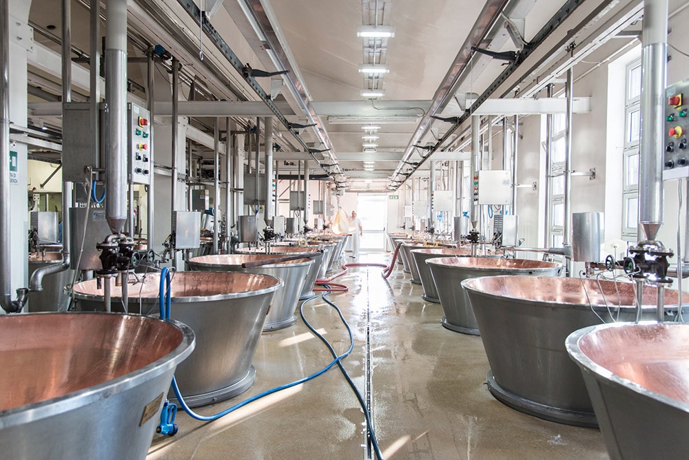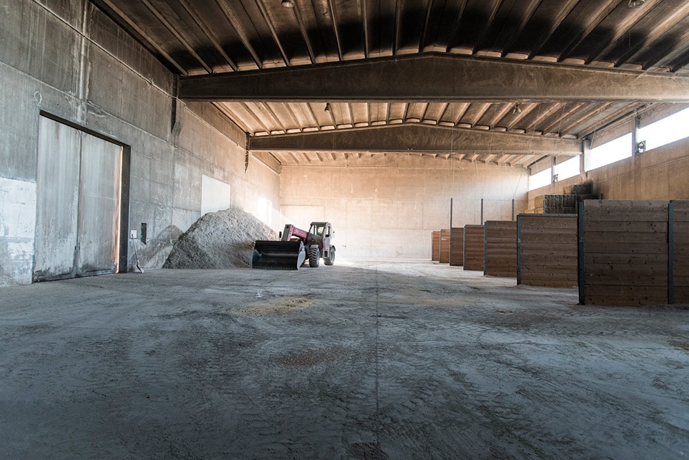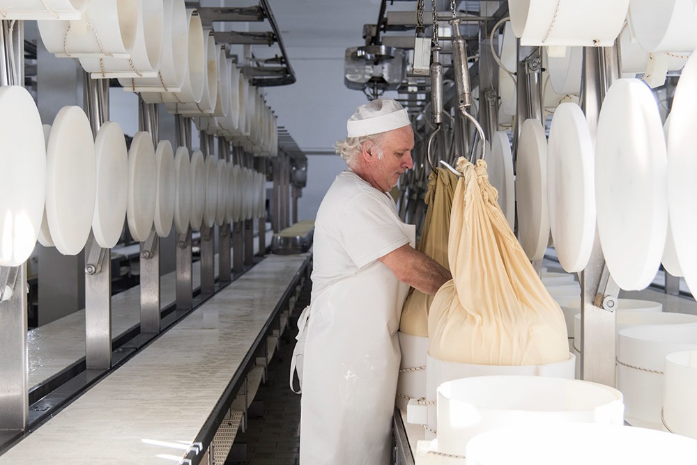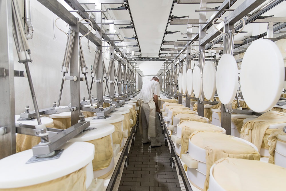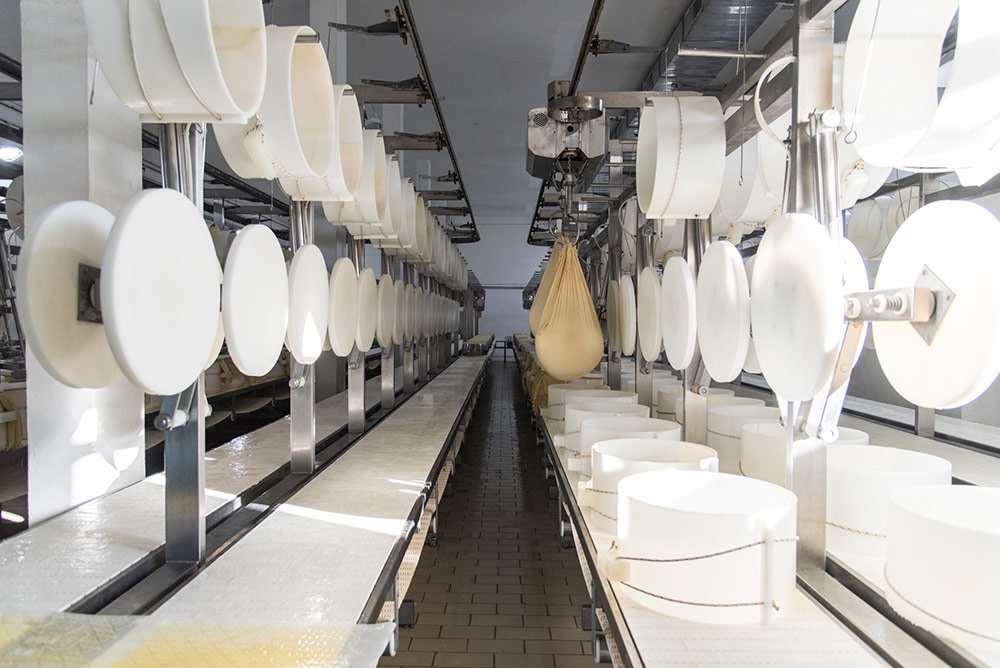 Nella sala di formatura è stata installata una pressatrice pneumatica che consente di calibrare in modo variabile il peso del coperchio sulle forme inserite nella fascera in teflon nel primo giorno di produzione. Particolarmente innovativo è l’impianto automatico di salatura a 6 piani: «Un flusso idrodinamico – sottolinea Dalla Rosa – consente l’immersione delle forme all’interno delle vasche e arriva a ospitarne complessivamente 4mila. Una volta completata la fase di salatura, che dura 20-22 giorni, sempre attraverso un flusso idrodinamico, le forme vengono spinte all’uscita per raggiungere il tunnel di lavaggio e successivamente il magazzino di stagionatura».