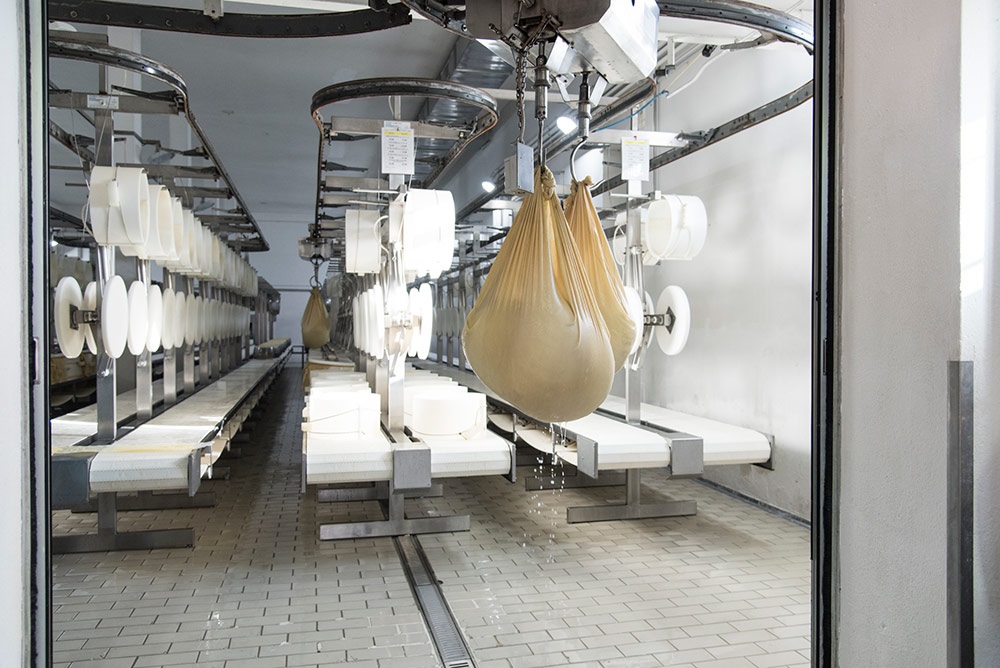 Sempre per ridurre la fatica fisica di chi lavora in produzione, dal 1990 la cooperativa ha investito anche in un sistema di movimentazione delle forme tramite nastri trasportatori e teleferica.