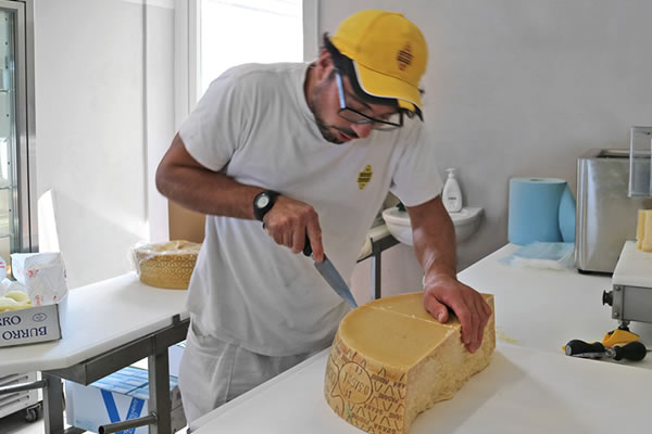 Oltre al Grana Padano, Fabio produce caciotte e ricotta che vende allo spaccio dove è molto richiesto anche il tosello. Si tratta di alcuni ritagli di pasta del formaggio prodotto la mattina e destinato a diventare Grana Padano.