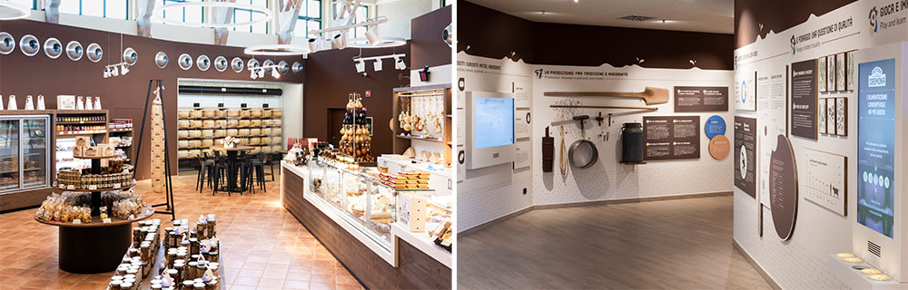 La Bottega di Fattorie Cremona, il punto vendita aperto al pubblico nel 2018 e a destra il percorso didattico multimediale sul mondo dei formaggi all’interno dell’ex stabile del Consorzio Agrario.