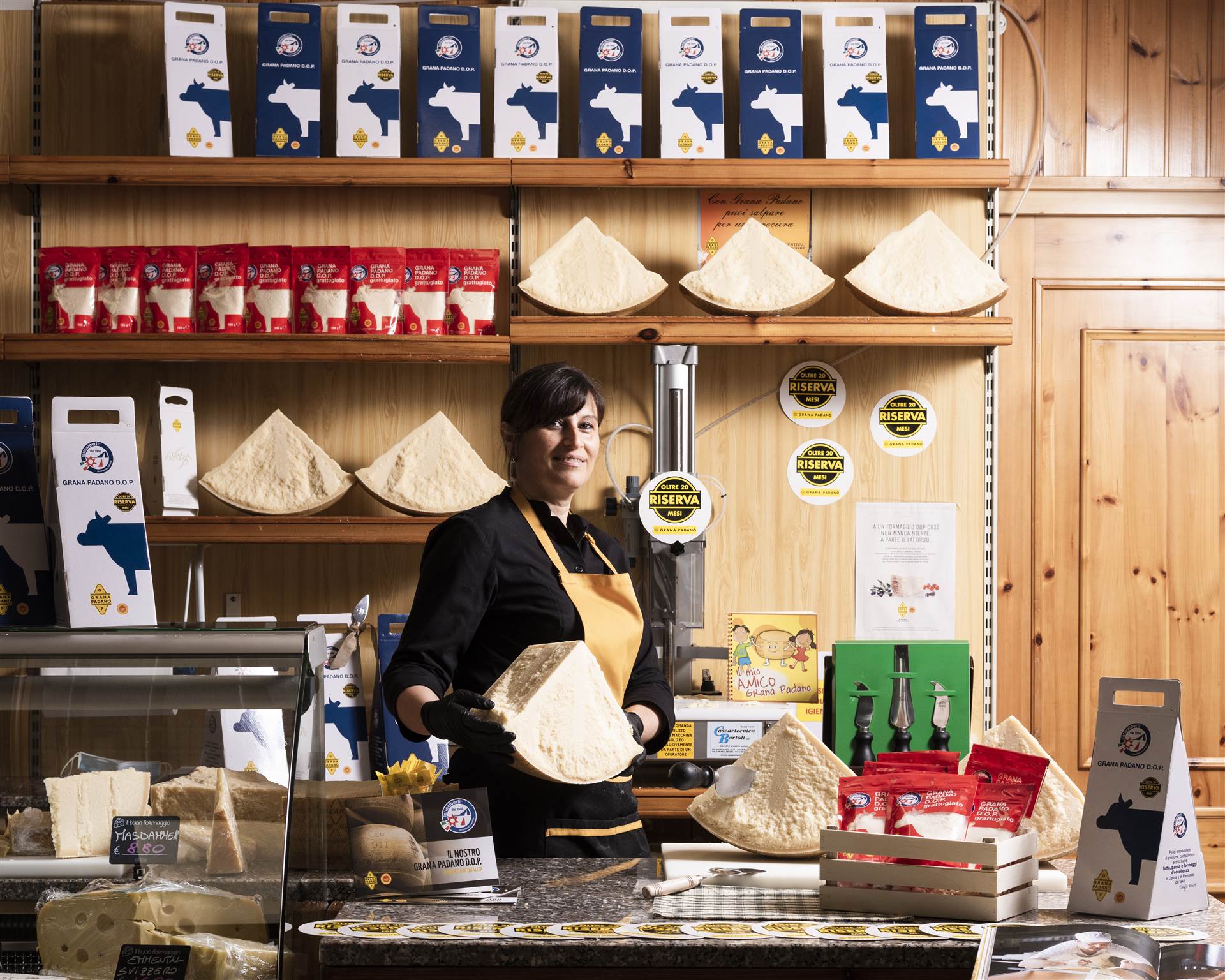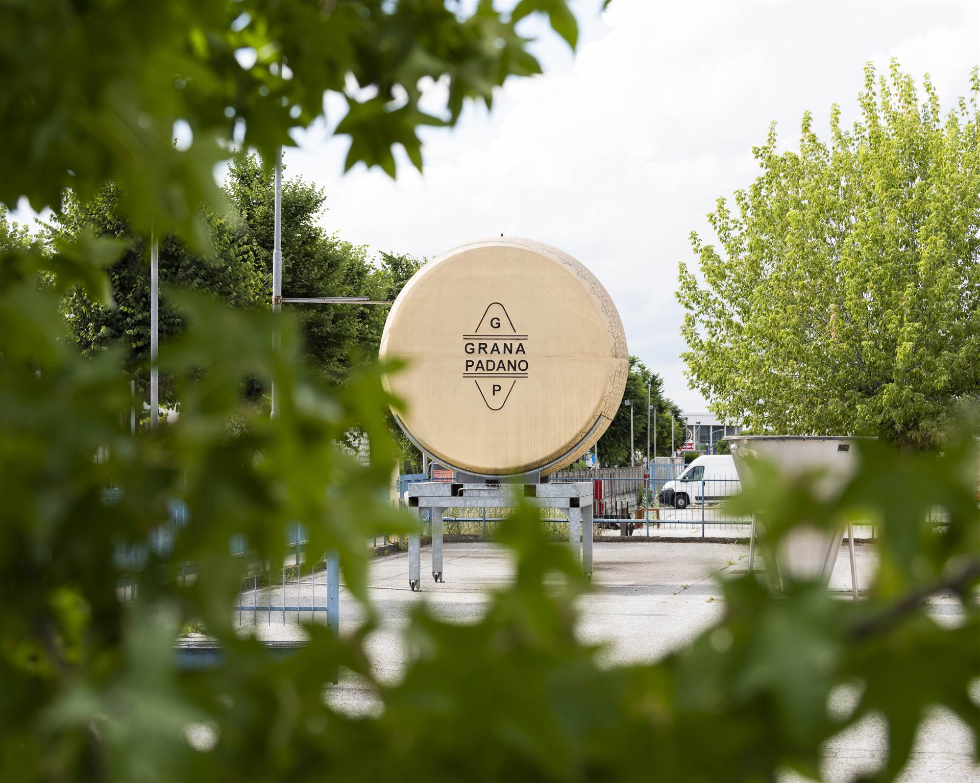 Una forma di Grana Padano davanti al Caseificio Genola latte