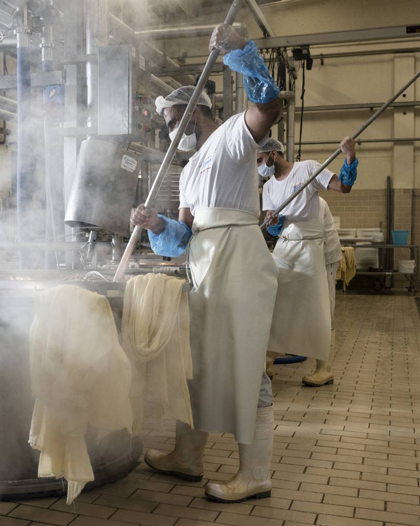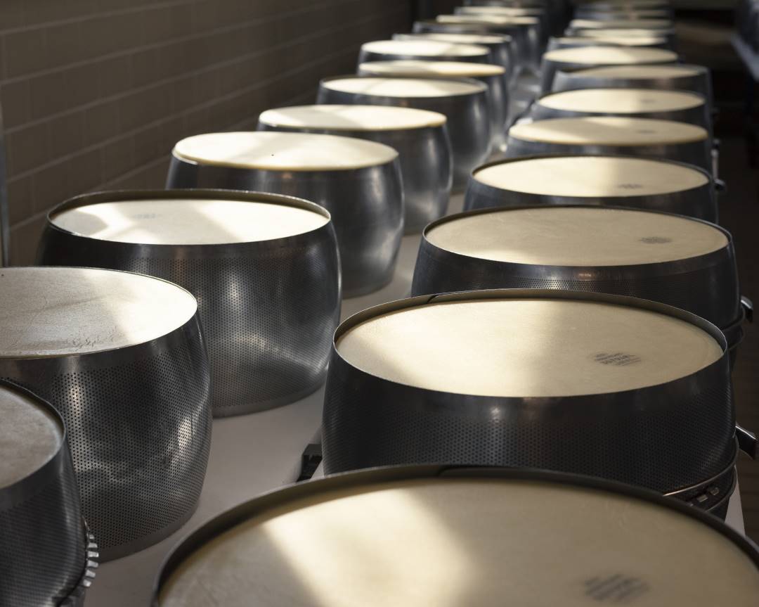 Negli stabilimenti Saviola la fase di produzione di Grana Padano DOP segue rigorosamente il disciplinare di produzione e alcuni passaggi, come ad esempio la lavorazione del latte, la rottura della cagliata tramite lo spino, fino al taglio e all’estrazione delle due forme gemelle con teli di lino, richiedono sempre la mano sapiente del casaro.