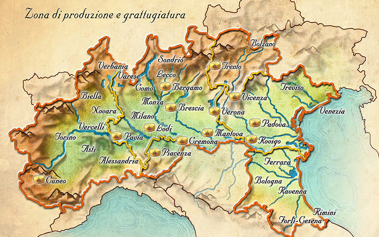 Il logo “Il nostro latte” è costituito da un’immagine a sfondo giallo che rappresenta l’Italia divisa per regioni, ma con due dettagli rilevanti: la dicitura “Il nostro latte proviene solo da qui” si riferisce alle zone geografiche evidenziate in nero, che corrispondono ai territori da cui proviene il latte utilizzato per la produzione di una determinata confezione di Grana Padano. Tale logo può essere utilizzato, su base volontaria, su tutte le confezioni di Grana Padano destinate sia all’Italia che all’estero da tutti i consorziati e dai confezionatori autorizzati.