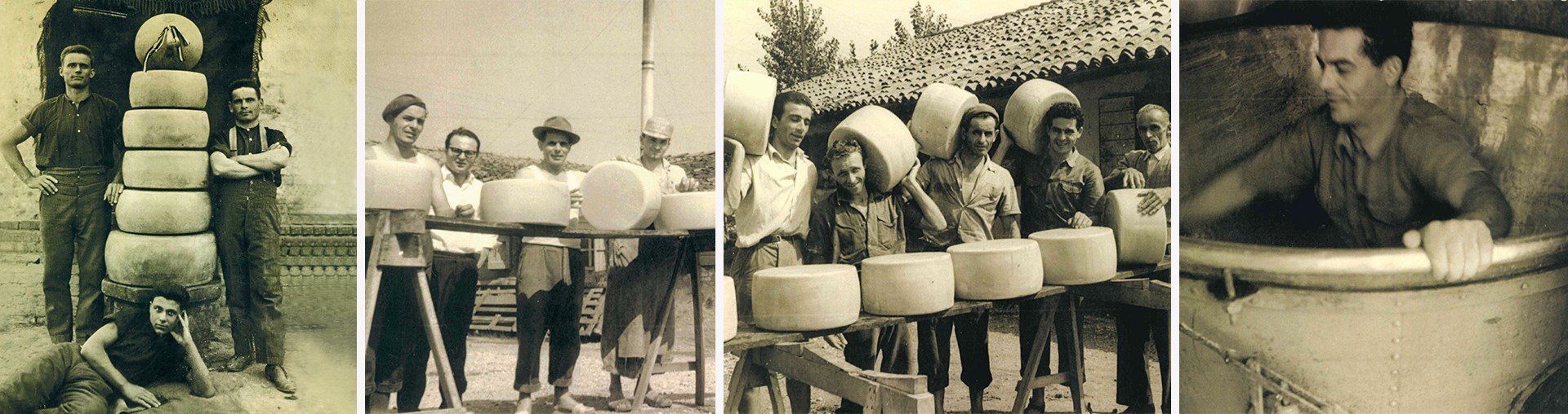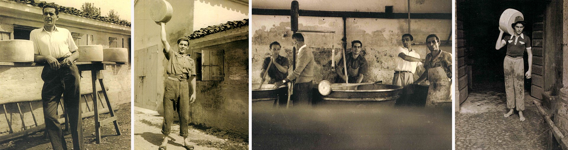 (Foto 7) – Lavorazione del formaggio Grana al caseificio “Cantona”, Guglielmo Adami, il caciaio Belladelli, Amedeo Farina, Bruno Verzola e Roberto Belladelli, figlio del caciaio