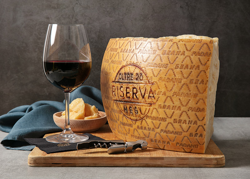 La decisa struttura del vino si trova in concordanza con le caratteristiche di evoluzione e maturità del Grana Padano Riserva. Inoltre, la nota salata mediamente percettibile del formaggio è adeguatamente equilibrata dalla componente morbida del vino.