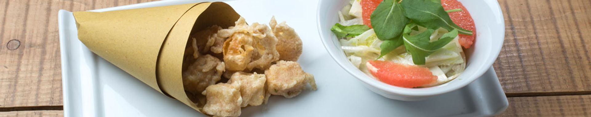Frittelle di Grana Padano, insalata di finocchi e rucola al pompelmo rosa