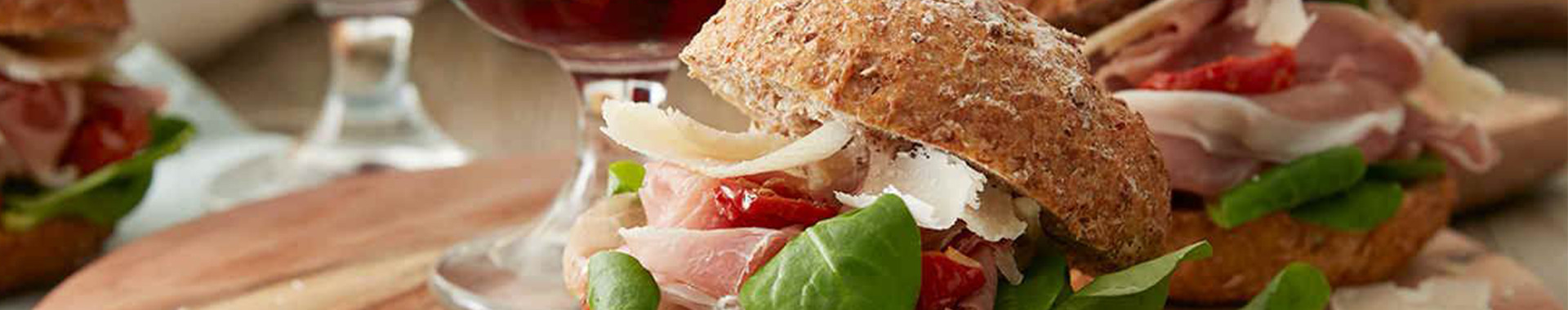 4 panini ai cereali 50 g di Grana Padano 200 g di prosciutto crudo 50 g di pomodori secchi sott’olio 1 cespo di valeriana