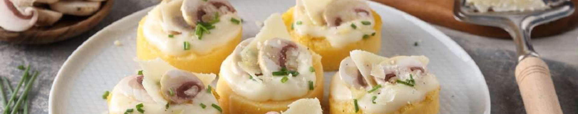 Disponete i dischi di polenta fritta su un piatto da portata, aggiungete su ognuno un cucchiaio di crema di Grana Padano Riserva e i funghi affettati. Servite le polentine guarnendo con erba cipollina, scaglie di Grana Padano e una macinata di pepe.