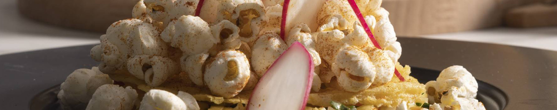 Tartare di frutta e verdure, cialde di Grana Padano e pop corn