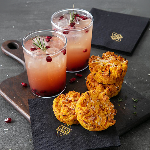 Perfetti da condividere con chi amiamo di più, questi cocktail analcolici di melograno e sambuco, abbinati a delle mini sbrisolone con carote, Grana Padano DOP e pinoli, sono l’ideale per sorprendere tutti durante le feste.