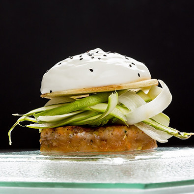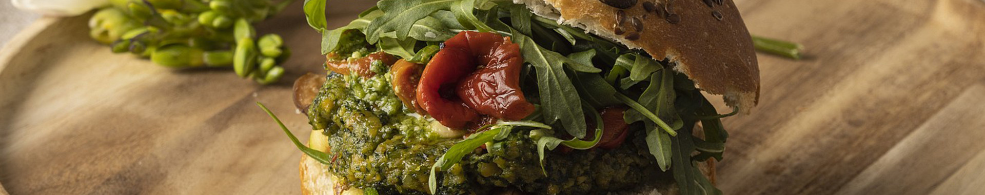 Tagliare a metà i panini e farcirli con il burger. Unire i peperoni, le zucchine, le rondelle di melanzane, la salsa al basilico, la rucola e un petalo di Grana Padano.