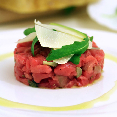 Carpaccio di manzo con capperi, rucola e scaglie di Grana Padano Riserva