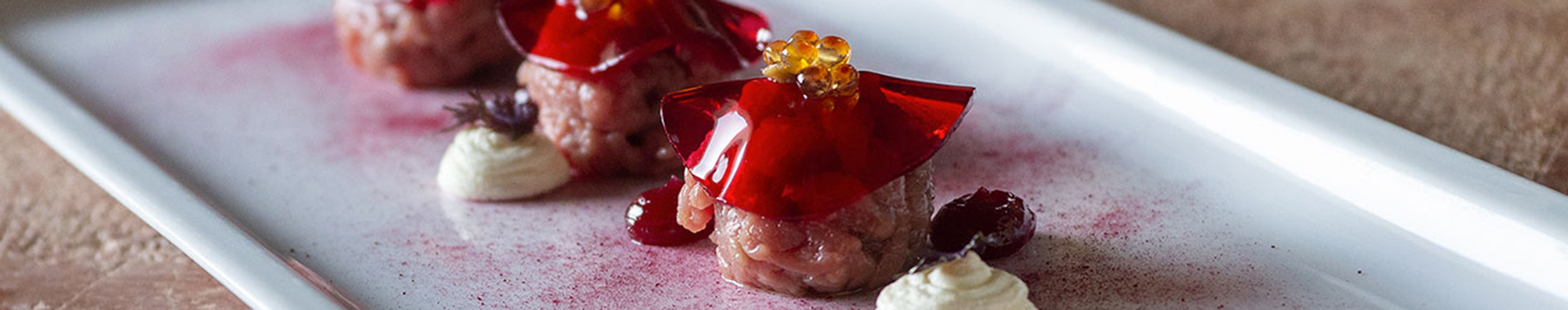 Sistemare al centro del piatto la tartara, guarnirla con il gel di rapa rossa, aggiungere la