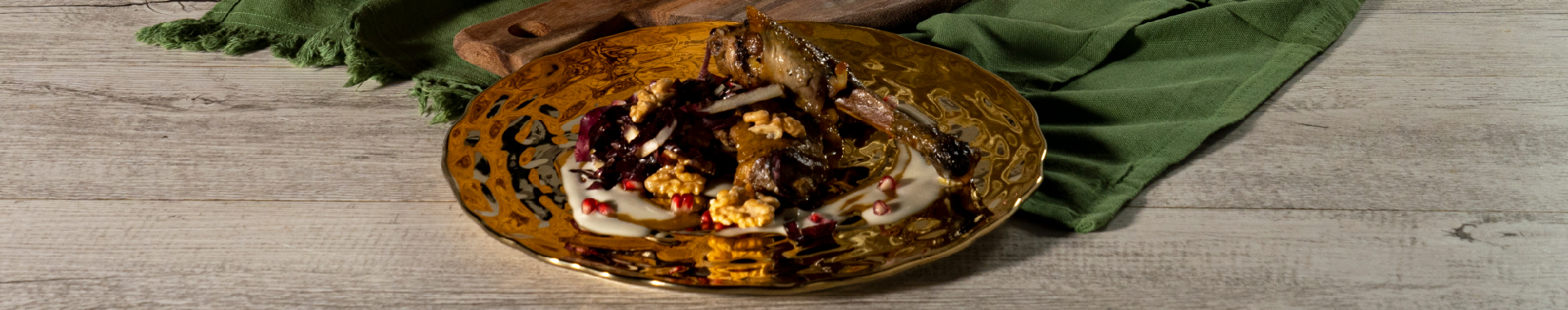“Disegnare” la base del piatto da portata con un po’ di salsa della faraona, quindi aggiungere la fonduta di Grana Padano DOP; Adagiare al centro del piatto una sovracoscia di faraona, ed appoggiarvi sopra la coscia; Adagiare affianco l’insalatina di radicchio, completando il piatto con qualche altro chicco di melograno e gheriglio di noce.