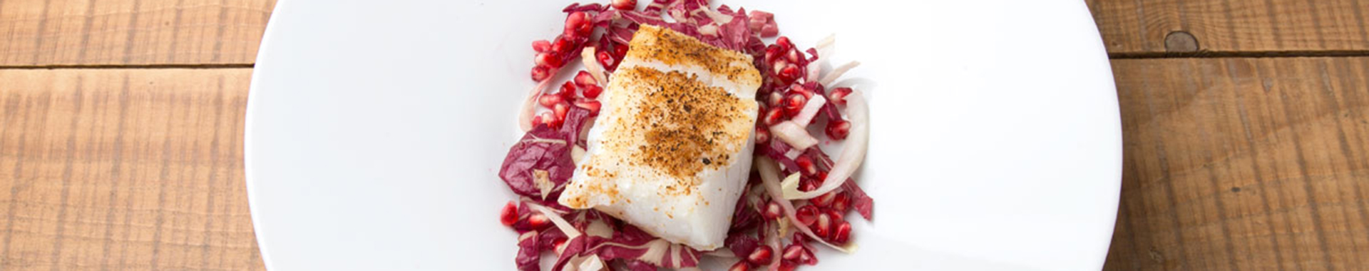 Filetto di baccalà gratinato al panettone e Grana Padano, insalata di indivia e melagrana