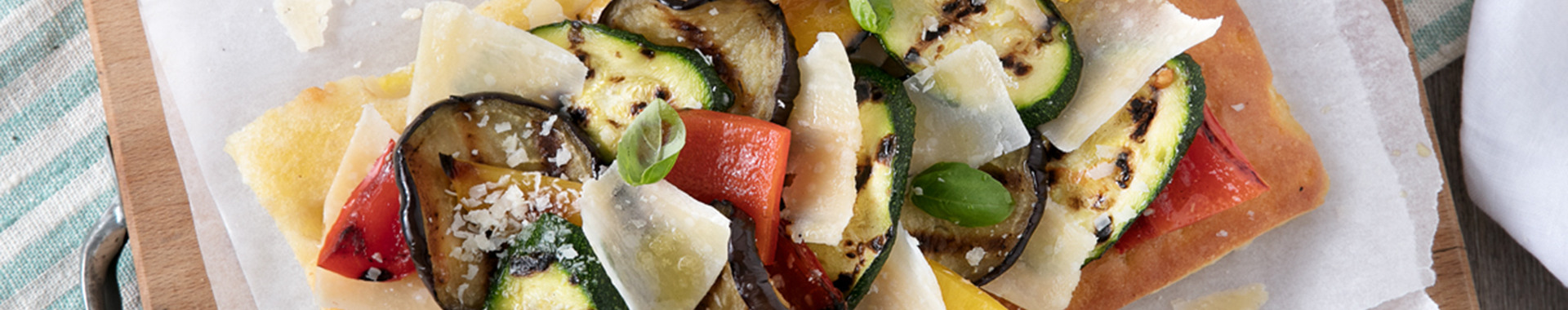 Sfornate la focaccia, conditela con le verdure grigliate e scaglie di Grana Padano, rimettetela in forno spento ma ancora caldo per qualche minuto.