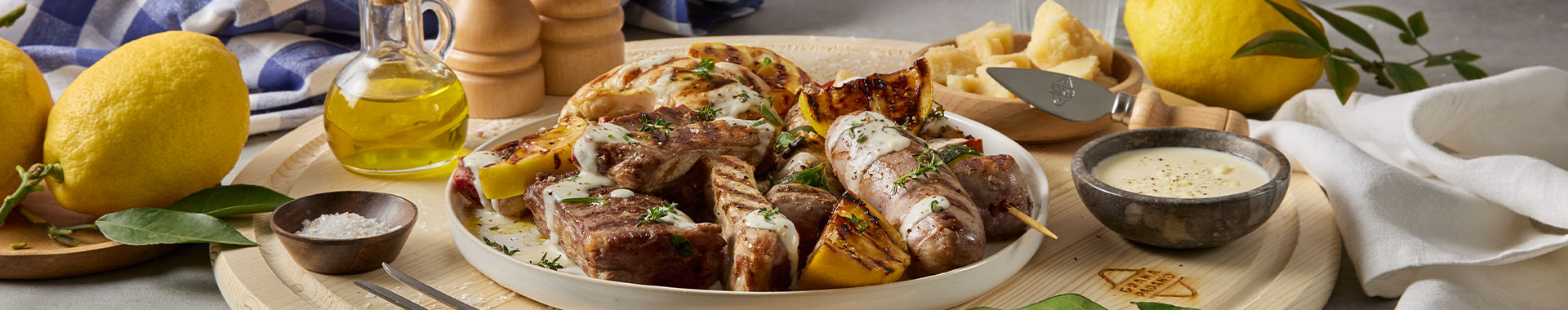 Disponete le carni e le verdure grigliate su un piatto da portata, versate la crema al Grana Padano in una ciotola separata o nappate leggermente le carni con essa.