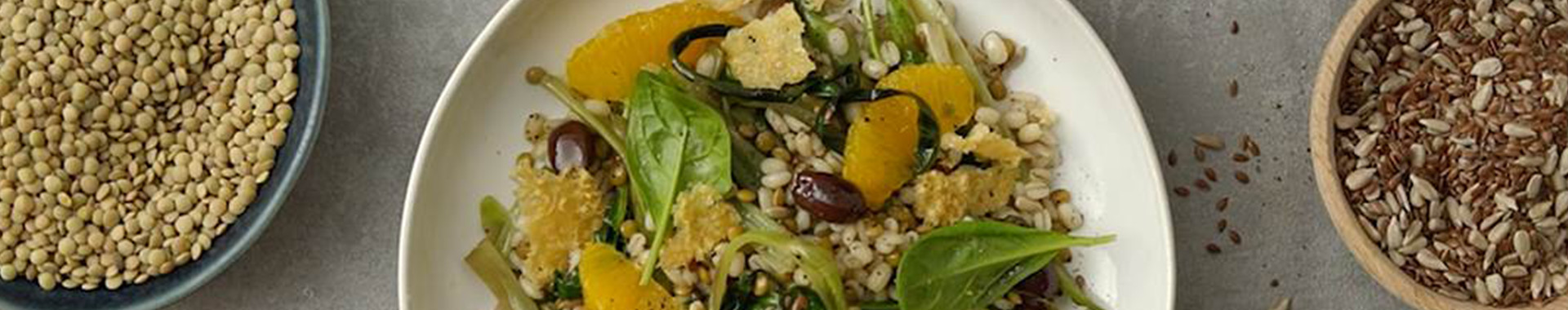 Servite l’insalatona tiepida aggiungendo le fettine di arancia, le cialde di Grana Padano Riserva e un filo di olio extravergine di oliva, guarnendo con semi di lino e semi di girasole.