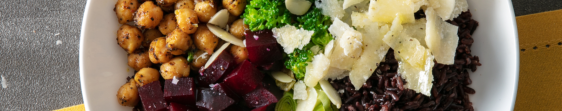 Riso nero, broccoli al vapore, cavolo viola, porri, ceci e scaglie di Grana Padano