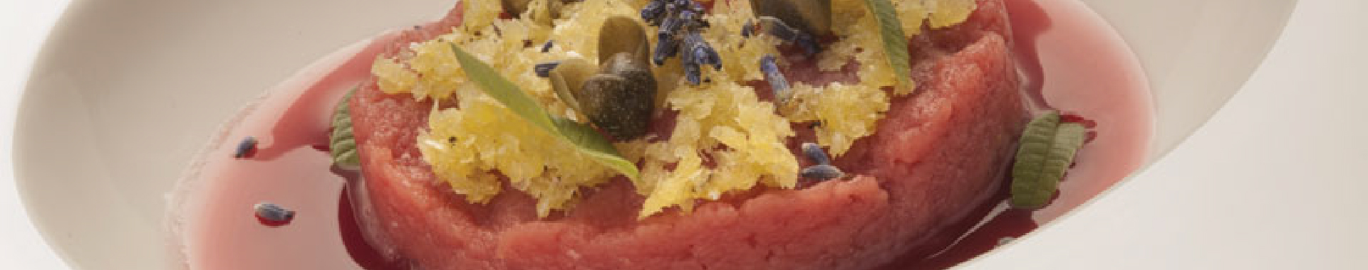 Tartare di scamone, Grana Padano marinato alla lavanda, centrifugato di anguria