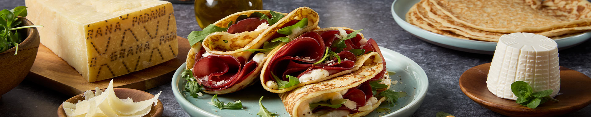 Spalmate su ogni crêpe uno strato di crema di Grana Padano, aggiungete qualche fettina di bresaola e completate con la rucola fresca. Piegate le crêpes a metà o arrotolatele, infine servite.