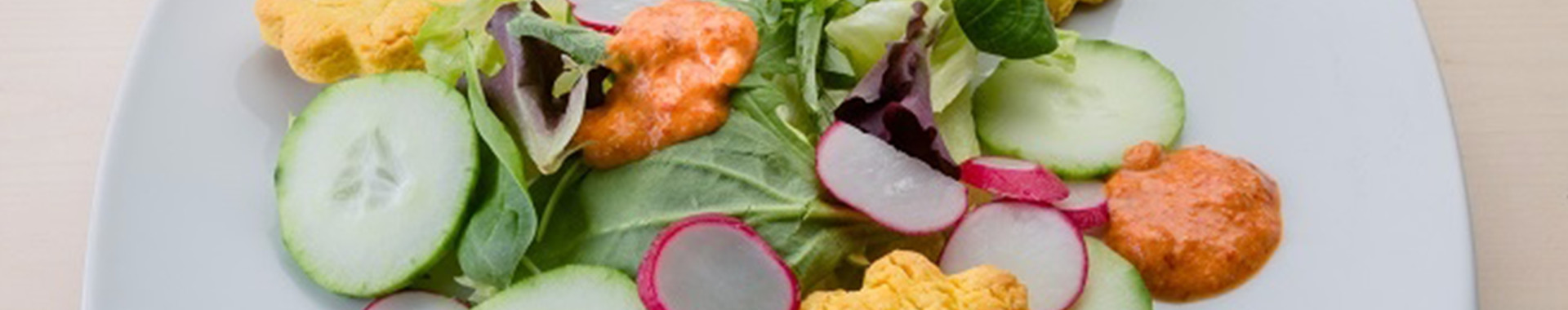 Insalata di lattuga, rapanelli e misticanza con salsa di peperoni arrostiti e biscotti al Grana Padano