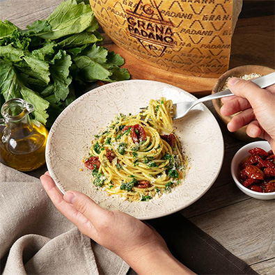 Un primo piatto semplice e genuino, perfetto per chi cerca un’alternativa senza glutine senza rinunciare al gusto. Le penne si uniscono alla freschezza dello spinacino, alla sapidità delle olive taggiasche e al tocco inconfondibile del Grana Padano Riserva: pochi ingredienti, un grande risultato.