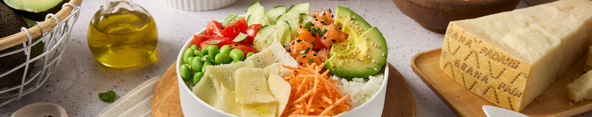 salmone, edamame, avocado, cetriolo e carote. Completate con le scaglie di Grana Padano DOP, una spolverata di semi di sesamo e, se lo desiderate, un filo di salsa di soia.
