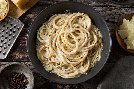 E per quanto riguarda il formaggio? Il segreto per una cacio e pepe cremosa al punto giusto è utilizzare il Pecorino Romano DOP, le cui proteine hanno la proprietà di sciogliersi nell’acqua creando la tipica cremina di questo piatto. Per donare ancora più gusto puoi sperimentare con le innumerevoli varianti e aggiungere al pecorino una quantità uguale di Grana Padano DOP, che con il suo gusto inconfondibile completa alla perfezione la cacio e pepe alla romana.