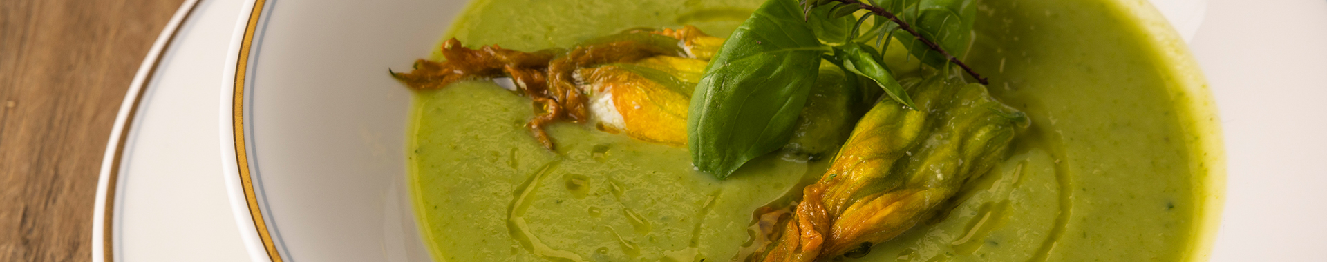 Crema di zucchine, basilico, pistacchi, con fiori ripieni al Grana Padano DOP Riserva