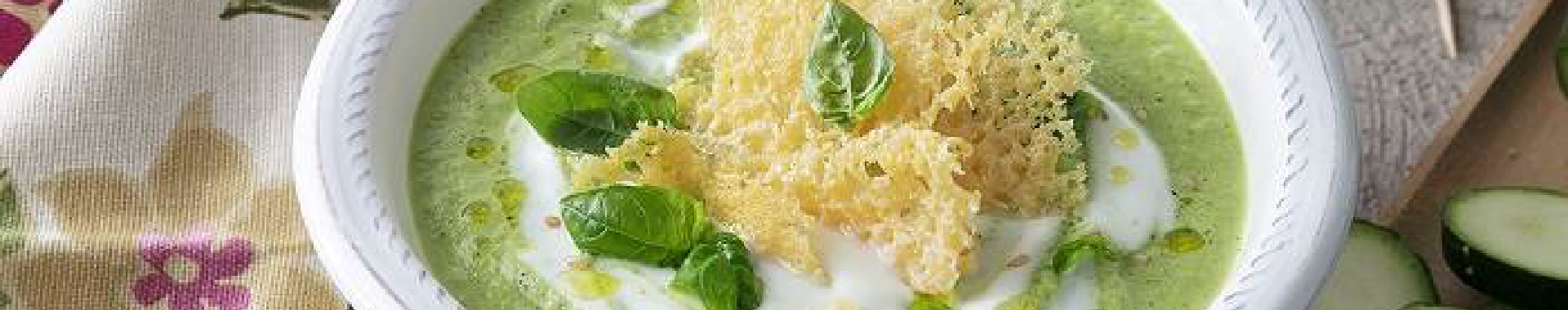 Servite la crema di zucchine con cialde di Grana Padano spezzettate e foglie di basilico.