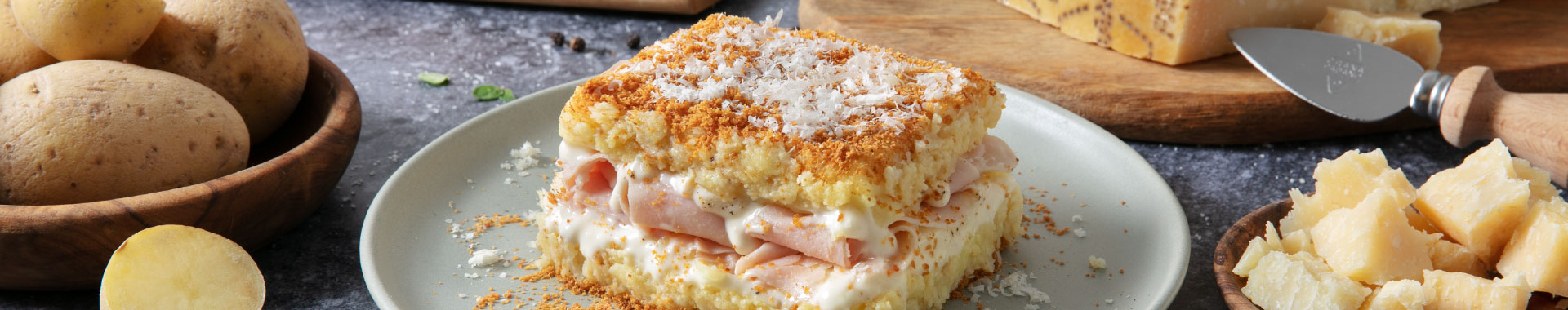Il gateau di patate è un classico sformato tipico della tradizione italiana del meridione. È conosciuto anche come gattò di patate, timballo di patate, pate di patate, sartù di patate o addirittura gatto al forno, e le prime testimonianze della sua presenza sulle tavole del Regno delle due Sicilie sono attestate a partire dalla fine del XVIII secolo. La ricetta gateau di patate è stata rivisitata diverse volte nei secoli, ma ogni volta il risultato è un delizioso timballo da gustare in compagnia. Vediamo insieme come preparare il gateau di patate al forno con Grana Padano DOP.