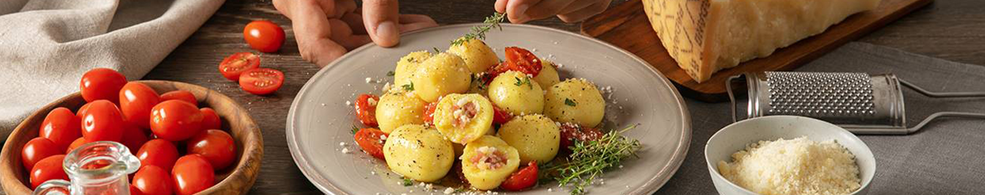 Gnocchi ripieni di pancetta e funghi, Grana Padano, timo e pomodoro