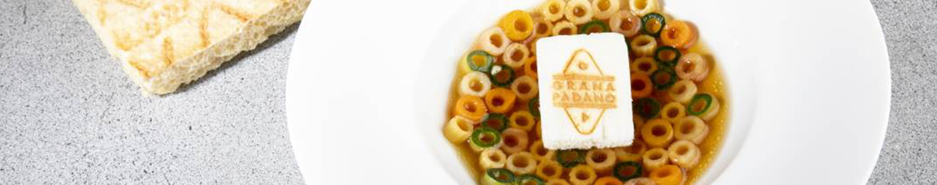 Stendere la meringa all’altezza di 5 cm. sopra un silpat per poi porre a seccare a 60 C° per 12 ore. Una volta che la meringa risulta completamente secca marchiarla con il timbro del Grana Padano, tagliare della misura di 7cm. per 4 cm. e dorare sotto la salamandra. Tagliare le verdure all’altezza di 0,5 cm. e stamparle prima con un coppa pasta da 1 cm. e all’interno con uno da 0,6 cm. Ricavare 100 unità e tenere da parte.