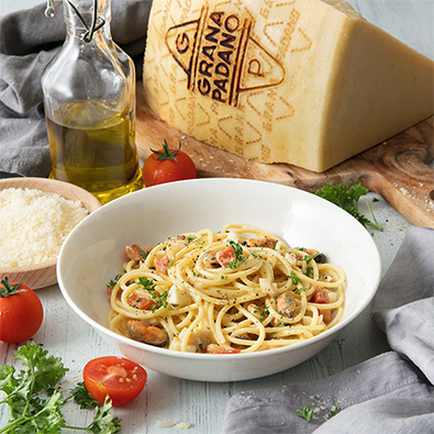 320 g di tubetti 1 kg di cozze 200 g di ceci Rosmarino q.b. Timo q.b. 1 spicchio di aglio Olio q.b. 70 g di Grana Padano DOP Riserva Oltre 20 mesi Mezzo bicchiere di vino bianco