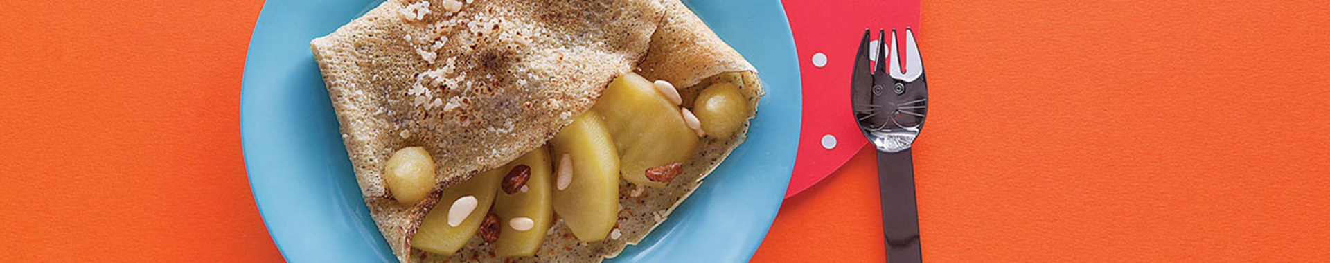 Per le galette, lavorare le due farine con il latte e l’acqua, salare appena il composto e lasciarlo riposare per 20 minuti. In una padella antiaderente calda versare un piccolo mestolino di pastella, cuocere da entrambi i lati, continuare fino a formare tutte le galette. Sbucciare le mele, privarle del torsolo, tagliarle a spicchi, farle cuocere in padella con poca acqua e frullarne la metà. Unire agli spicchi di mela i pinoli, l’uvetta e metà Grana Padano grattugiato.